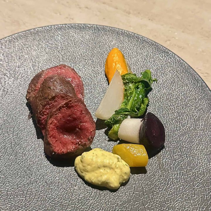 蝦夷鹿のロースト。低温調理してからオーブンで焼き上げているためクセがなく、旨みが凝縮された一品。自家製タラゴンなどスパイスを効かせたハーブのソース、三浦半島の野菜とともに。
