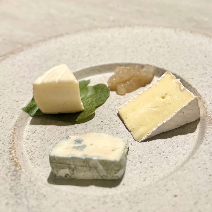 桜チーズ、高秀牧場のアオカビチーズ、三良坂フロマージュのカマンベール、冬瓜とリンゴとオレガノと自家製キムチのペーストを添えて。