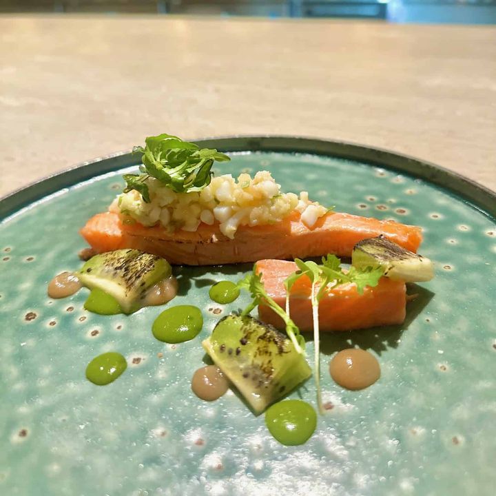 この日のコースのメインは、北海道産のサーモン。イカとリンゴとクレソンのタルタル、熊本産の炙りキウイを添えて。コース料理¥7,700(アミューズ、スターター2 種、メイン、デザート、ミニャルディーズ)、¥10,000(アミューズ、スターター2種、メイン2種、デザート、ミニャルディーズ)