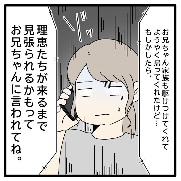 「お兄ちゃん家族も駆けつけてくれて、ようやく帰ってくれたけど・・もしかしたら、理恵たちが来るまで見張られるかもってお兄ちゃんに言われてね」お母さんの言葉にゾッとして青ざめる私。