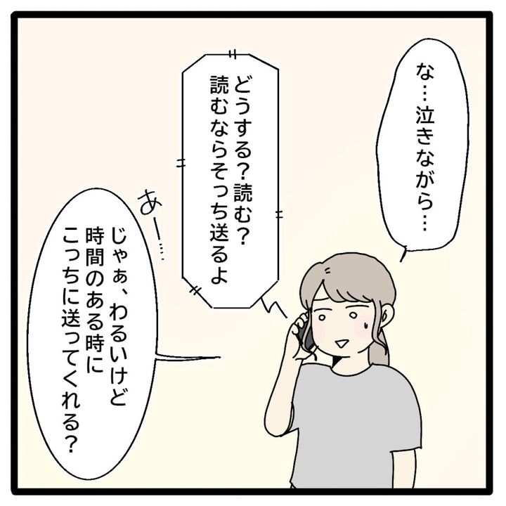 「な・・泣きながら・・」戸惑いながら私がそうつぶやくと、「どうする?読む?読むならそっち送るよ」お母さんにそう言われ、「あー・・じゃあ、悪いけど、時間のある時にこっちに送ってくれる?」と、とりあえず送ってもらうことにしたのでした。