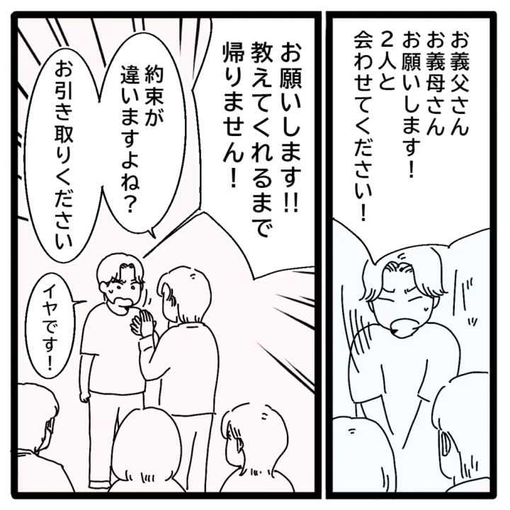 「お義父さんお義母さんお願いします!2人と会わせてください!」と頭を下げる正志は、「お願いします!!教えてくれるまで帰りません!」と言い、お父さんが「約束が違いますよね?お引き取りください」と言っても「イヤです!」と言うことを聞かなかったようで・・。