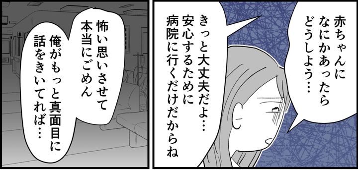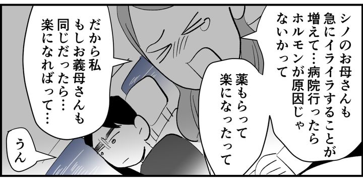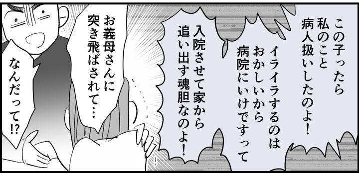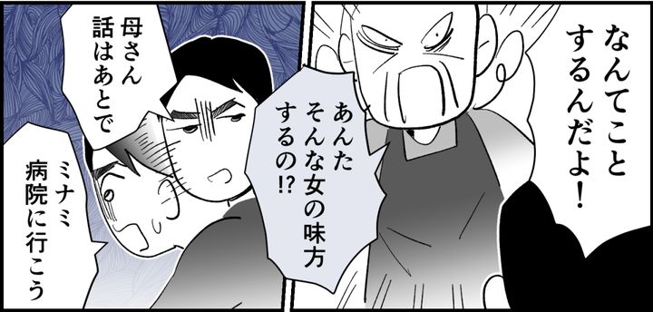 私はミナミ。友人シノから、「義母のイライラはホルモンバランスの乱れが原因かもしれない」と指摘されました。帰ってすぐ同居の義母に、病院受診や相談窓口でアドバイスをもらうことを提案。しかし義母の逆鱗に触れたらしく、「私が病気だっていうの!?」と激しく怒鳴られました。そのうえ感情的になった義母に突き飛ばされてしまったのです。あまりに突然のことで、とっさにお腹の赤ちゃんを庇うことしかできませんでした。心臓がバクバクと鳴り響きます。