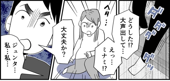 義母が私を突き飛ばした音と罵倒する声を聞きつけて、2階で在宅ワーク中だったジュンタがすぐに駆けつけてくれました。