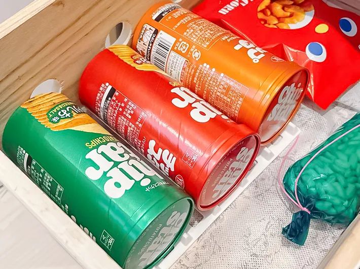 ヤマザキビスケット株式会社が販売する『チップスター』のような筒形のお菓子をのせても、引き出しの中で転がりませんでした。