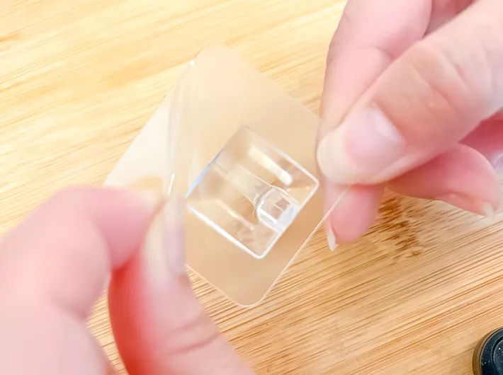 フックの後ろに、透明の粘着シートがついているので、はがして使いましょう。