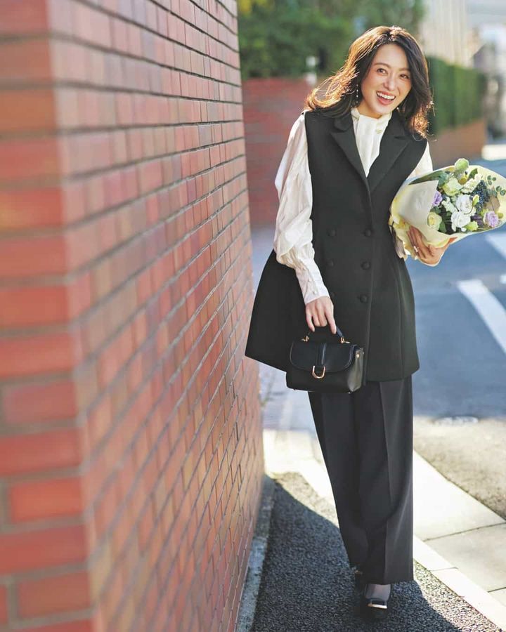 ジレ¥13,800ブラウス¥6,420(ともにミュー)パンツ¥15,950(DAY by DAY It,s international)バッグ¥22,900(チャールズ&キース/チャールズ&キース ジャパン)パンプス¥33,000(銀座かねまつ/銀座かねまつ6丁目本店)ピアス¥27,500〈ebiki〉リング¥18,700〈yuma〉(ともにロードス)ストッキング¥1,100(靴下屋/タビオ)