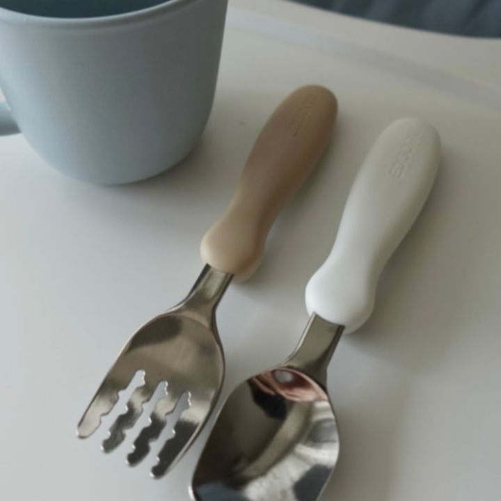 給食スプーンはエジソンのものを使っています。シンプルで握りやすそう。フォークの溝が麺なども絡みやすく食べやすいみたいです🍴✨✨