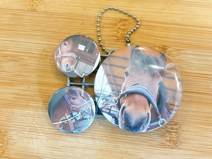 息子の推しである『神社の馬』の缶バッジをたくさんつけることができました!