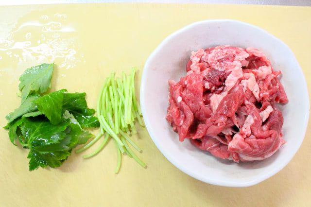2. 三つ葉を2cm長さに、牛肉を食べやすい大きさに切ります。