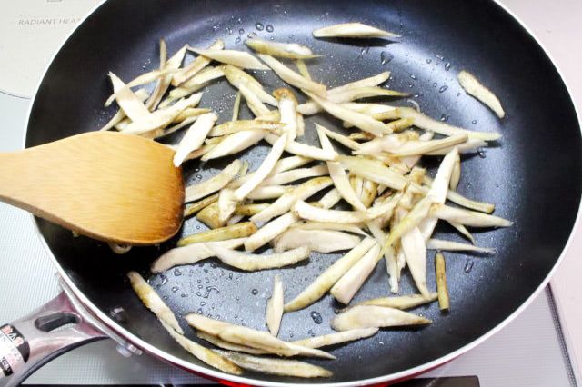 ごぼうは硬いので先に油で2分ほど炒めました。炒めることで香りも立ちます。