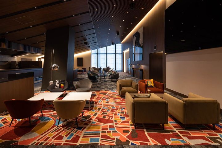 空間をアートへと昇華させる演出も見逃せない。4階ロビーの『Lumière』は、トラフ建築設計事務所が意匠設計を、クリエイティブスタジオWOWが映像演出を担当した光のシャンデリア。球体の表面をボロノイ分割した鏡面が、複雑な反射を繰り返す万華鏡のような美しさを見せる。また、12階ホワイエの巨大LEDディスプレイ『Motion Ceiling』には幻想的な天井画が映し出され、レストラン「バール パノーラマ」から望む街の景色と鮮やかに呼応する。圧倒的なスケール感と繊細な美意識が共存するこの場所は、最新テクノロジーと現代のアート表現が心地よく融合した、次世代のカルチャー拠点といえるだろう。