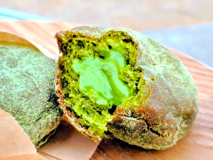 サクッフワッモチッとした生地には、外側にも抹茶をふんだんにふりかけています。一口食べると抹茶の旨味がグッと押し寄せてくるリッチな一品!