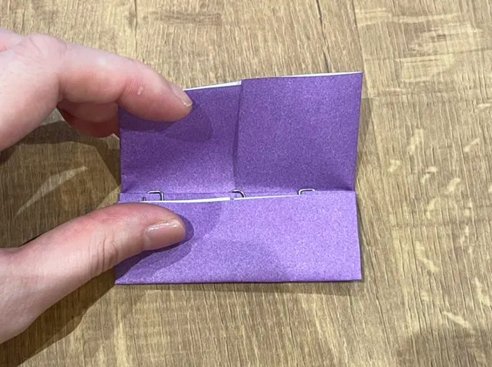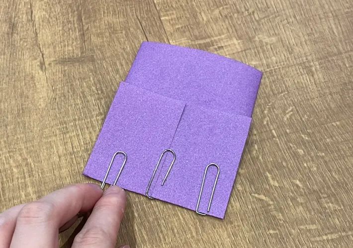 先ほどの工程で折った部分を押さえるように、3つのゼムクリップを等間隔に装着します。