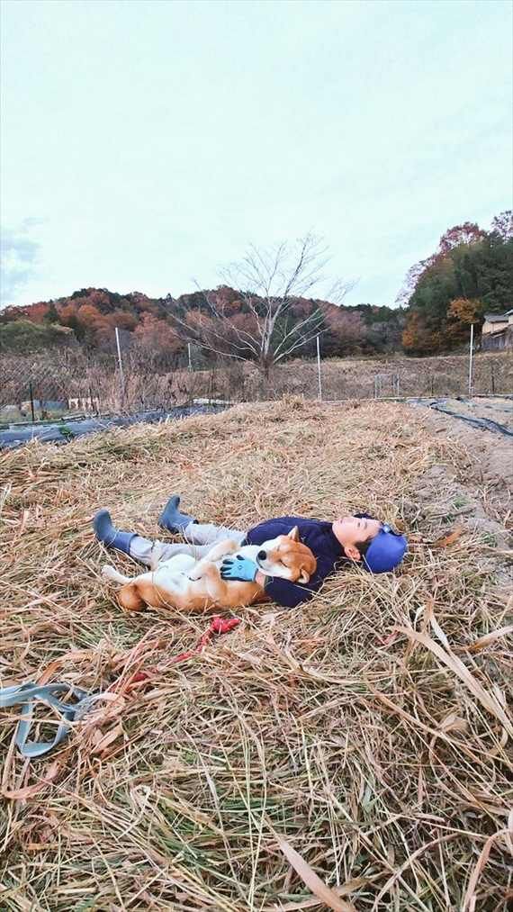 3. 仲良くウトウト。藁の上で気持ちよさそうに横になる男の子と柴犬の姿が話題に「藁って何気に暖かい」「素敵な腕枕で幸せそう」