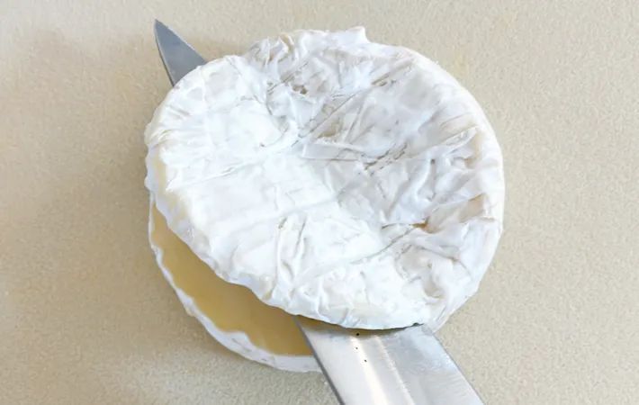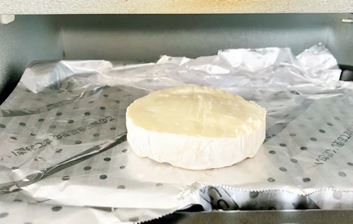 アルミホイルを敷いた天板にカマンベールチーズをのせ、オーブントースターで約4分、チーズがとろけるまで加熱します。