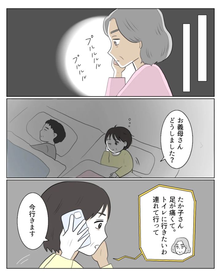 義母はというと、退院したもののまだまだ自由に動けるわけではないので、私が介助をすることもしばしば。この日の夜中も義母から電話がかかってきて「たか子さん、トイレに行きたいわ、連れて行って」と頼まれました。