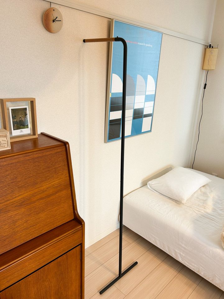 「友人が来客したときは玄関に移動させ、アウターを掛けてもらうことができます。それから急な雨で服が汚れたとき、サッと掛けて乾かしたい時にも。シンプルなデザインも場所を選ばないポイントかもしれません」