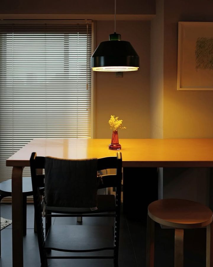 家族が集まるダイニングテーブルの照明には、artekのペンダントライトがありました。ダークグリーンが空間をギュッと引き締めてくれています。