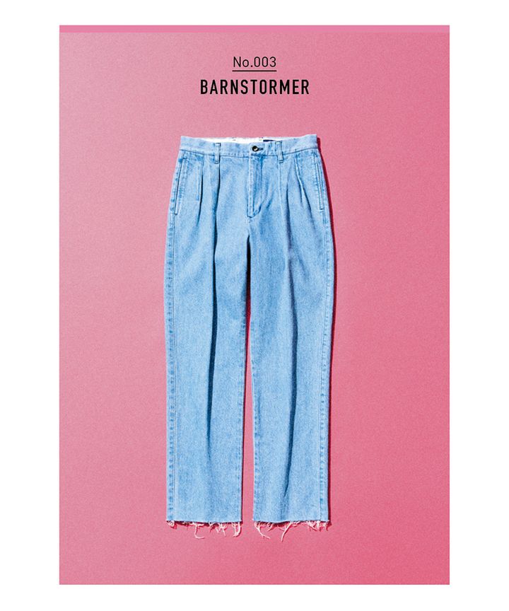 ブリーチタックデニムパンツ/BARNSTORMER(UTS PR) ドレス仕立てのチノパンで有名な、「BARNSTORMER」からブリーチデニムが登場。ツープリーツ&ゆるめのテーパードのスマートな形により、どう着ようと気品のある佇まい。