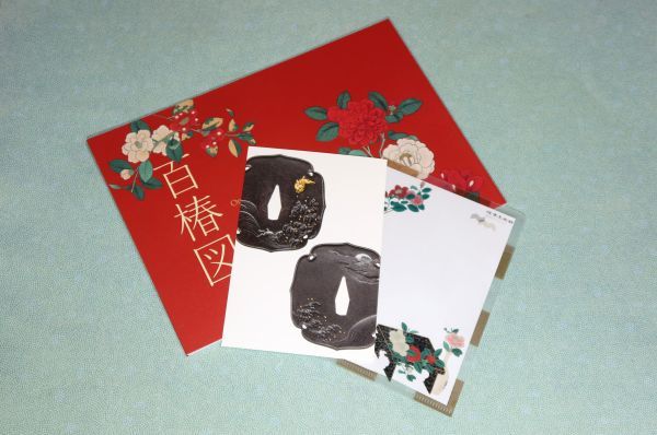 ミュージアムグッズは、図録『百椿図』(1‚200円)、《百椿図》の椿の意匠のクリアファイル(300円)、刀装具の意匠のポストカード(100円)を購入。
