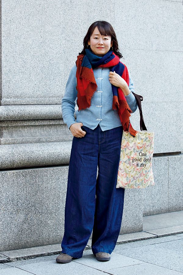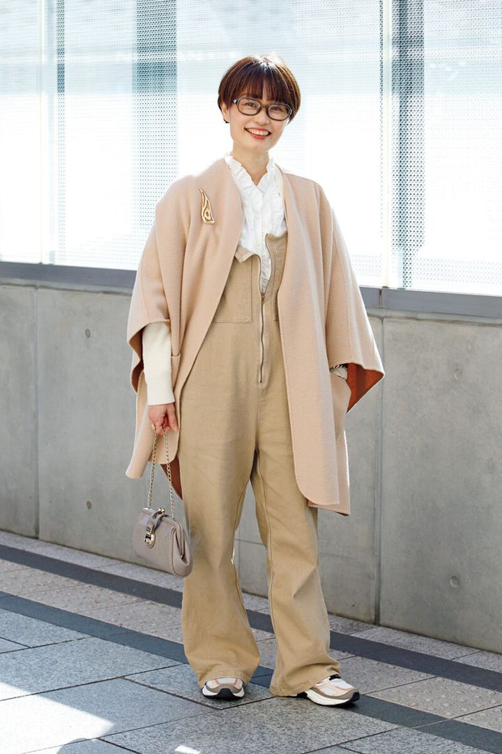 「テイスト違いのものをミックスして楽しんでいます」。袖を通さずに着られるポンチョは重ね着にも最適で、冬のおしゃれに大活躍。