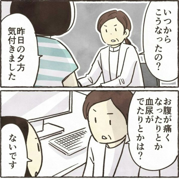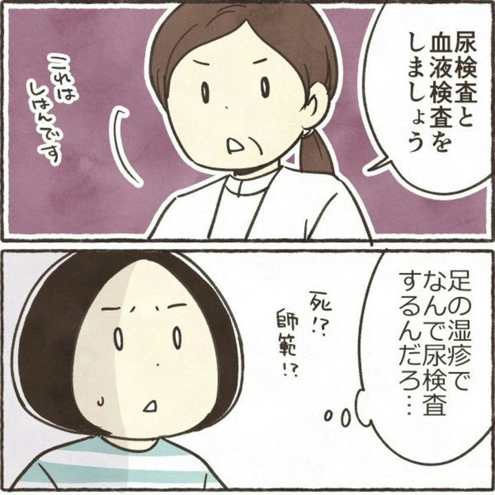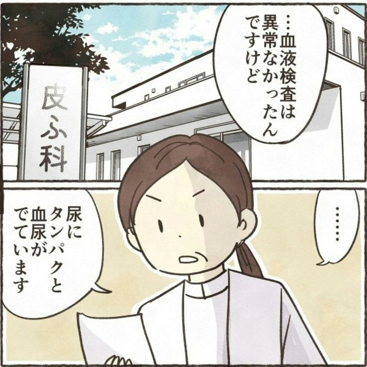 このお話は、著者・きなこ(@kinakogekiyasu)さんの実体験を元に描かれています。ある日突然、足にできた湿疹。見た目ほどかゆくないものの、念のため皮膚科を受診。ところが、医師からは神妙な面持ちで話をされ…。『血尿ものがたり』をダイジェスト版でごらんください。