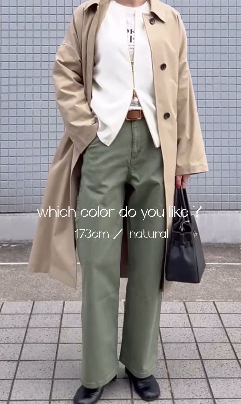 上からベージュのロングコートをさらりと羽織れば、落ち着いたアースカラーのグラデーションが完成し、洗練された雰囲気に。足元とバッグをブラックで統一して全体をきゅっと引き締めれば、ラフになりすぎない大人のワークスタイルにまとまります。