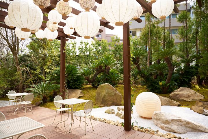 カフェから出られるテラスにある提灯は、前クリエイティブ ディレクターのマリア・グラツィア・キウリが京都で発表した2025年フォール コレクションで使用したものと、新たに導入したものが合わせて展示されています。