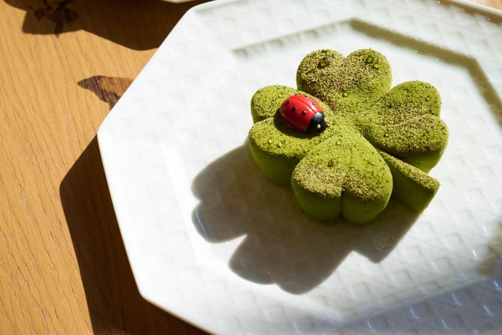 スイーツはメゾンの幸運の象徴を想起させる「ル トレフル」。こちらはピスタチオのビスキュイをベースに、玄米茶のムースやゆずのジュレを忍ばせ、抹茶でカバーされています。ピスタチオと調和した爽やかさとほろ苦さの繊細な味わいが特徴で、ジョナサン・アンダーソンへのリスペクトが詰まったケーキです。