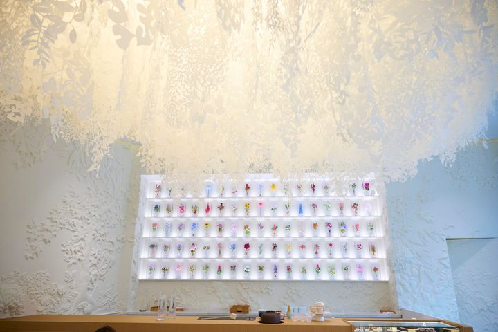 カフェエリア両サイドの壁に飾られているのは、《ブロックフラワー》という作品。レジンの中に生花を閉じ込めたもので、ムッシュ ディオールの生家に咲いていた花や、栗の花を始めとする日本の花々を集めて制作されています。