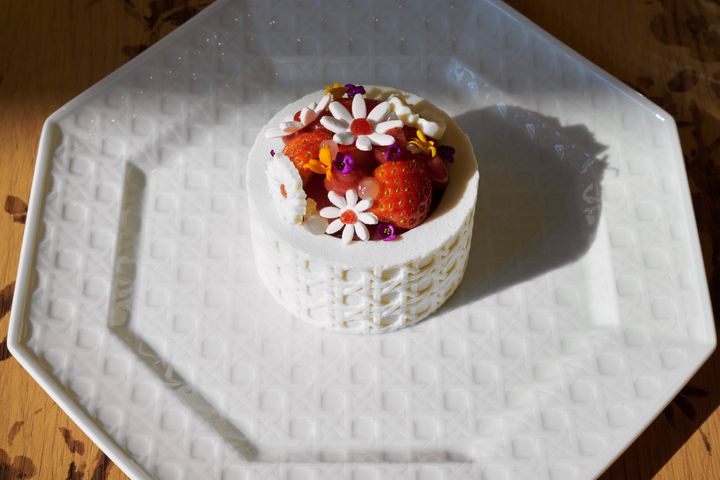 もうひとつのスイーツは、シェフが愛するイチゴと米、日本酒を合わせた「ル カナージュ シュクレ」。チョコレートコーティングしたお米のシュトロイゼルをベースにビスケットを乗せたライスプディングです。イチゴと柚子のコンフィが流し込まれ、日本の“縁”をイメージしたという円を描くような球体のケーキ上部にもイチゴのコンフィが彩りをプラス。日本酒とみりん、酒かすを合わせたジュレや日本酒ムースなど、和を感じさせる味わいに。