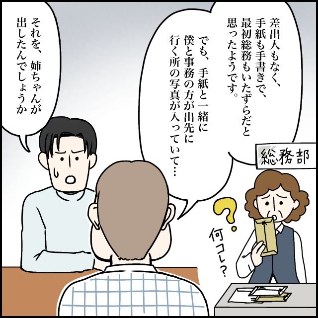 「差出人もなく、手紙を手書きで、最初総務もいたずらだと思ったようです。でも、手紙と一緒に僕と事務の方が出先に行く所の写真が入っていて・・」と話す勇也さんに「それを、姉ちゃんが出したんでしょうか?」と太一が聞きました。たしかに、差出人が書かれていないのに勇也さんはなぜ玲美さんが出したと思ったのでしょう。