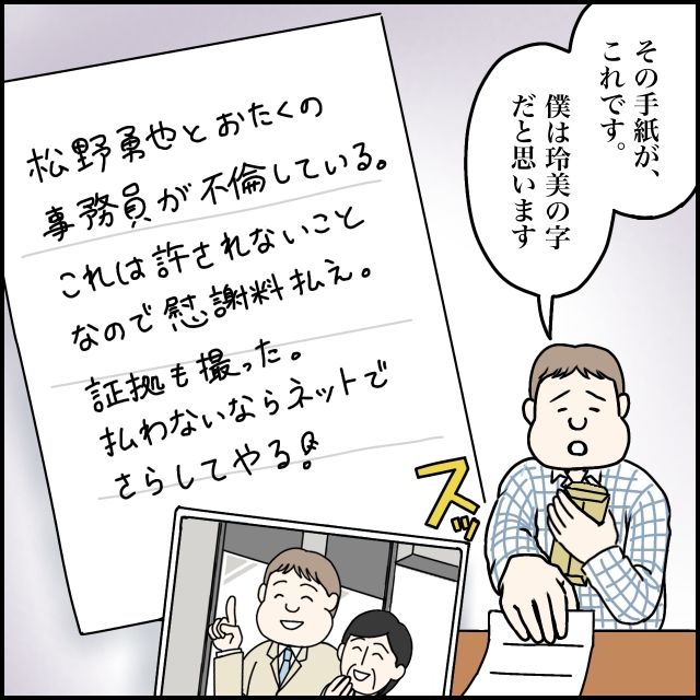 すると、「その手紙が、これです。僕は玲美の字だと思います」と、会社に送られてきたという手紙と写真をテーブルの上に出してみんなに見せた勇也さん。手紙には「松野勇也とおたくの事務員が不倫している。これは許されないことなので慰謝料払え。証拠も撮った。払わないならネットでさらしてやる!」と書かれていました。なんだか子どもが書いたような文章で、これは総務の人もいたずらだと思うだろうなと感じました。同封されていた写真も、勇也さんと女性が並んで歩いているだけで、とても不倫の証拠になるものには見えません。