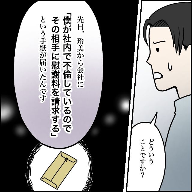 「どういうことですか?」と太一が聞くと、「先日、玲美から会社に『僕が社内で不倫しているのでその相手に慰謝料を請求する』という手紙が届いたんです」と静かに話し始めました。