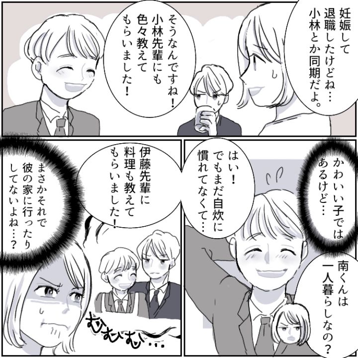 第1子を妊娠中のサオリ。同僚のテツヤと結婚して幸せな日々を送っていたが、最近は妙に夫の様子が怪しいのが気になっていた。テツヤの不倫を疑い、思い切ってスマホを盗み見するサオリ。なんとそこには衝撃的なやりとりが残っていた!?