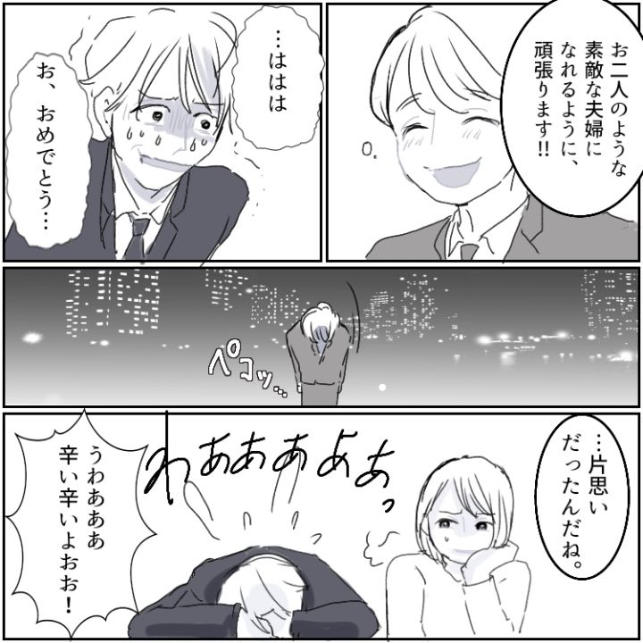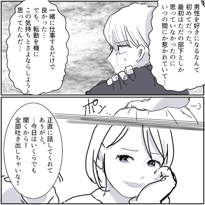 夫が男性に片想いしていたことに驚きつつも、朝まで彼を慰めたサオリ。今後も2人で支え合いながら、幸せな家庭を築いていってくださいね!