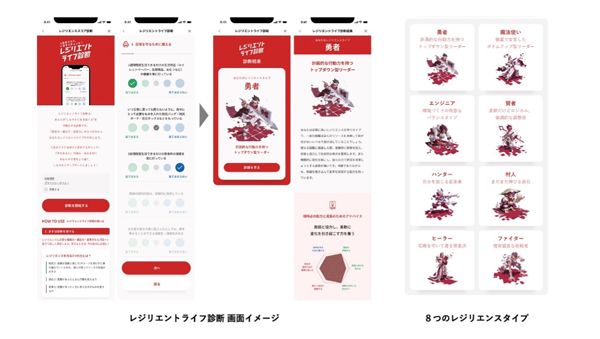 ミニアプリの目玉は、レジリエントライフ診断です。まず、性別、居住地などの個人情報を入力。「3日間程度生活できるだけの飲食料の備蓄を常に行っている」、「保険の契約内容は、定期的に見直している」など、31の質問に答えていくと、個人のレジリエンス能力を「吸収力」「適応力」「変革力」の組み合わせで判定。「勇者」「魔法使い」「ヒーラー」など、8タイプに分類し、強みや補いたい部分をわかりやすく教えてくれます。