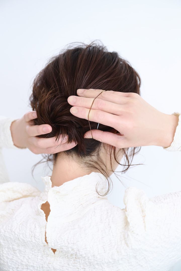 32㎜のカールアイロンで根元から毛先までラフにミックス巻きをします。全体を低めでゴムで結んだら毛束を丸め込み、もう1本のゴムを上からかぶせてシニヨンに。仕上げにシニヨンや顔周りの髪を軽く引き出します。