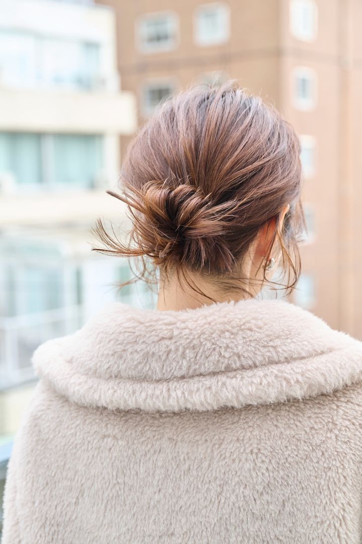 ②1つ結びだと寒々しいから低めシニヨンで暖かみを