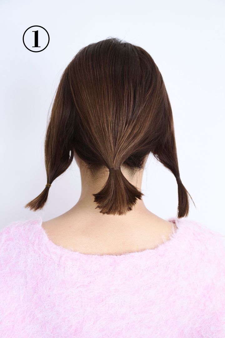 両耳の後ろで髪を分け、全体を3つに分けたら毛先をゴムで結びます。