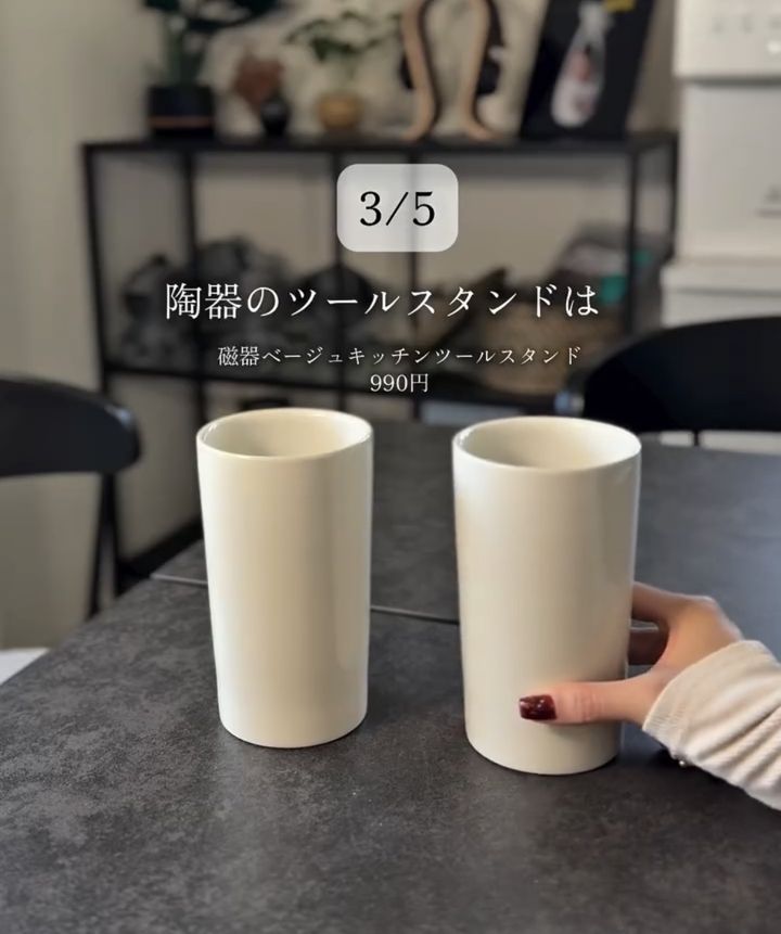 色感も統一されて、デザイン性も◎磁器ベージュキッチンツールスタンド