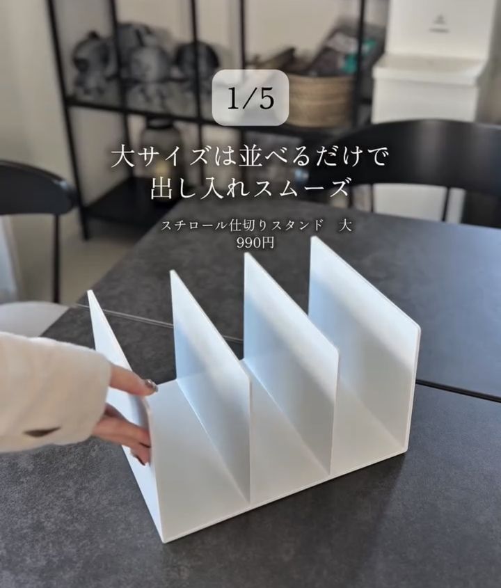 仕切りスタンドの「大」を二つ並べて配置するとき、あえて間に少し広めの幅を持たせてみてください。