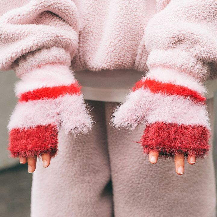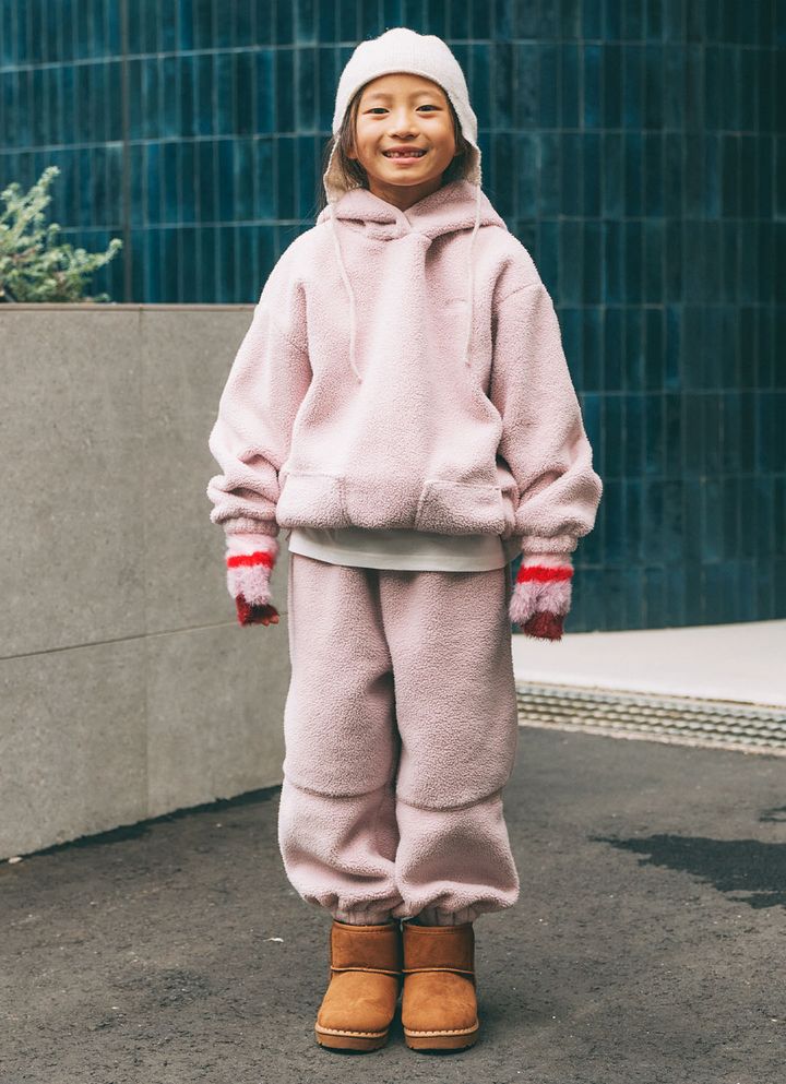 ピンク×レッドのボーダー手袋がキッズコーデの挿し色に抜擢! ふわふわ素材が、ボアセットアップとの相性も抜群で冬気分をぐっと盛り上げる。