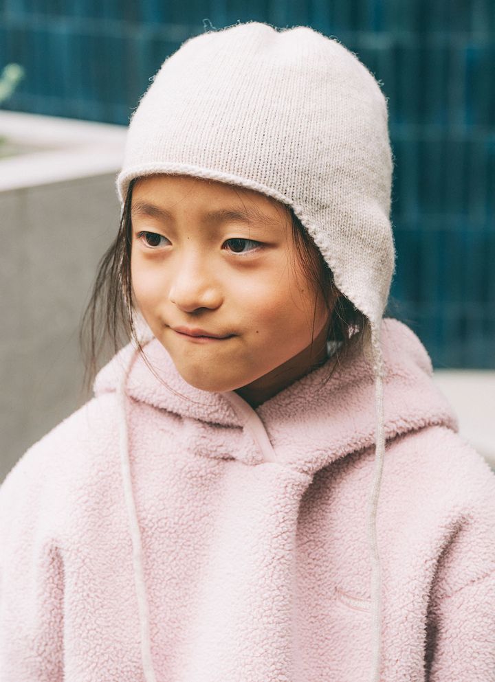 ホワイトのニット帽が、ピンクのトップスとやさしいトーンでマッチ。モコモコ素材の組み合わせが、冬のあたたかさを加速♪