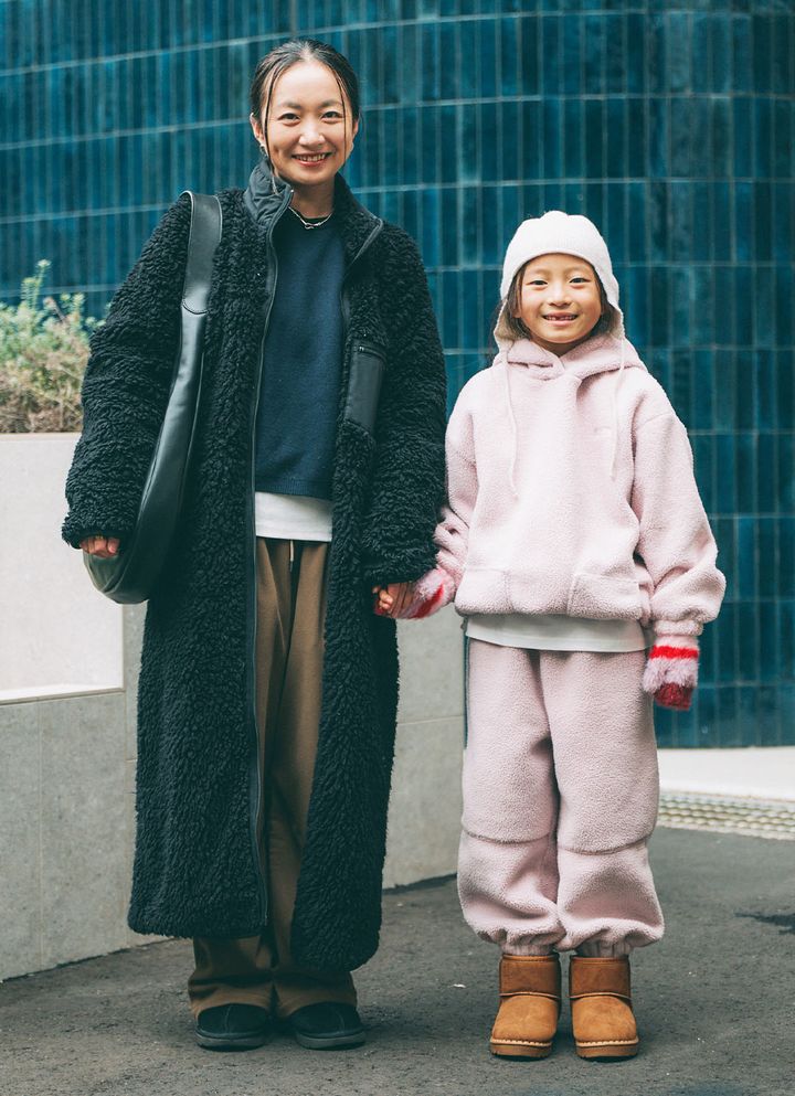 ママのブラックとキッズのピンク、対照的なカラーをボア素材でつないだ冬のあったか親子コーデ。ロングアウターにレザーバッグで、シックに決めたママと、ボアセットアップで可愛さ全開のキッズ。冬らしい小物をまといながらスタイリッシュに決めた、技あり冬コーデをキャッチ!