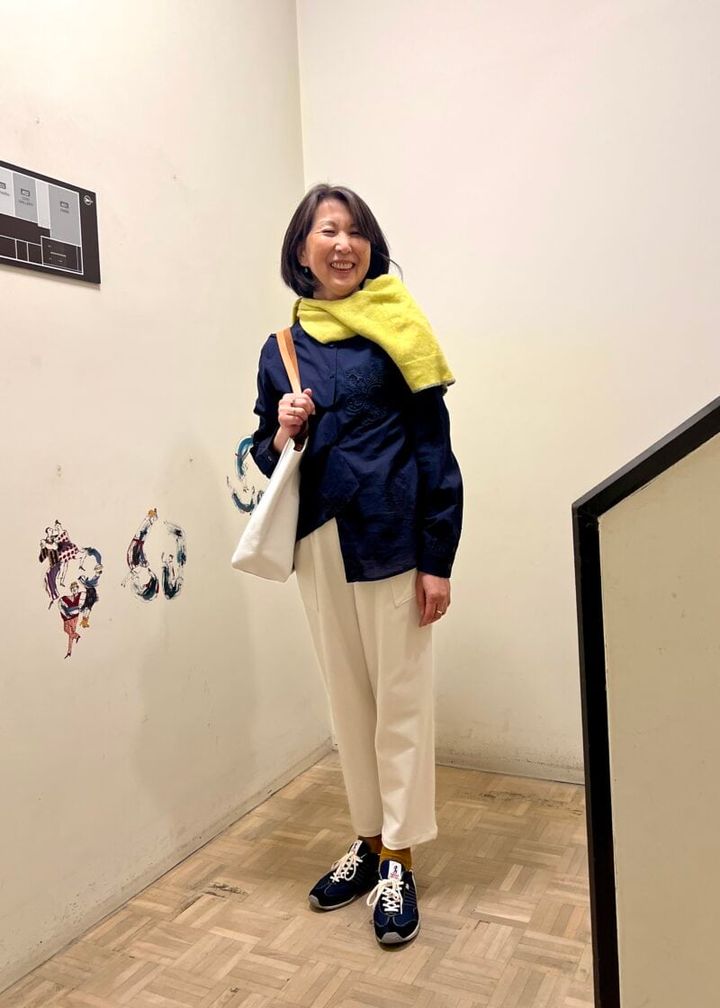 急に20度越えした2月の京都で、春服をショッピング中だったKAHKOさん。ベーシックなネイビー×ホワイトの着こなしも、それぞれ凝ったディテールが抜群におしゃれ。「歳を重ねて、ますますおしゃれを楽しみたいと思うようになりました」。服もアクセサリーも「長く付き合えるものを選びたいですね」。まだまだ朝夕は冷え込むので、キレイ色のカシミアニットをストールがわりに首元に。