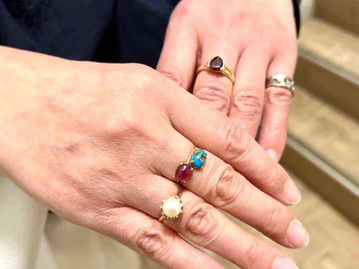 手元は、お気に入りの天然石のリングを重ね付け。10Kのターコイズリング、10Kのルビーリングは、ともに京都・三条の「ririchuchu(リリチュチュ)」で。