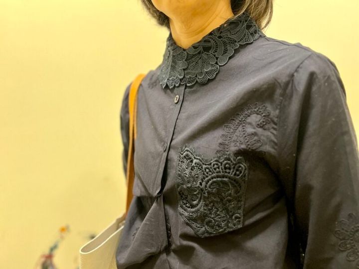 「ペイズリーのレースが気に入って、白と紺とずいぶん迷ったんですが、、、」。自らを「ほら、わたしって紺顔でしょ?」と破顔するKAHKOさん。甘くなりすぎないレース襟が大人世代にうれしいコットンシャツは、京都の「ririchuchu(リリチュチュ)」で。
