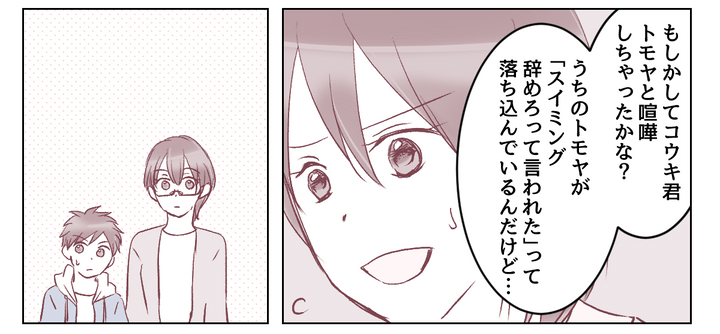 私はヨウコ。小学3年生の息子トモヤは、スイミングの選手コースで頑張っています。トモヤの憧れは5年生のコウキ君です。コウキ君は下級生の面倒見が良く、何をさせても優秀な子。しかし他の保護者のなかにはコウキ君の陰口を叩く人もいます。コウキ君に嫌がらせをされて辞めた子もいる、気を付けた方がいいというのです。私には信じられない話でした。上級生のレーンに移ったトモヤは、大好きなコウキ君と一緒に泳げることを喜んでいました。